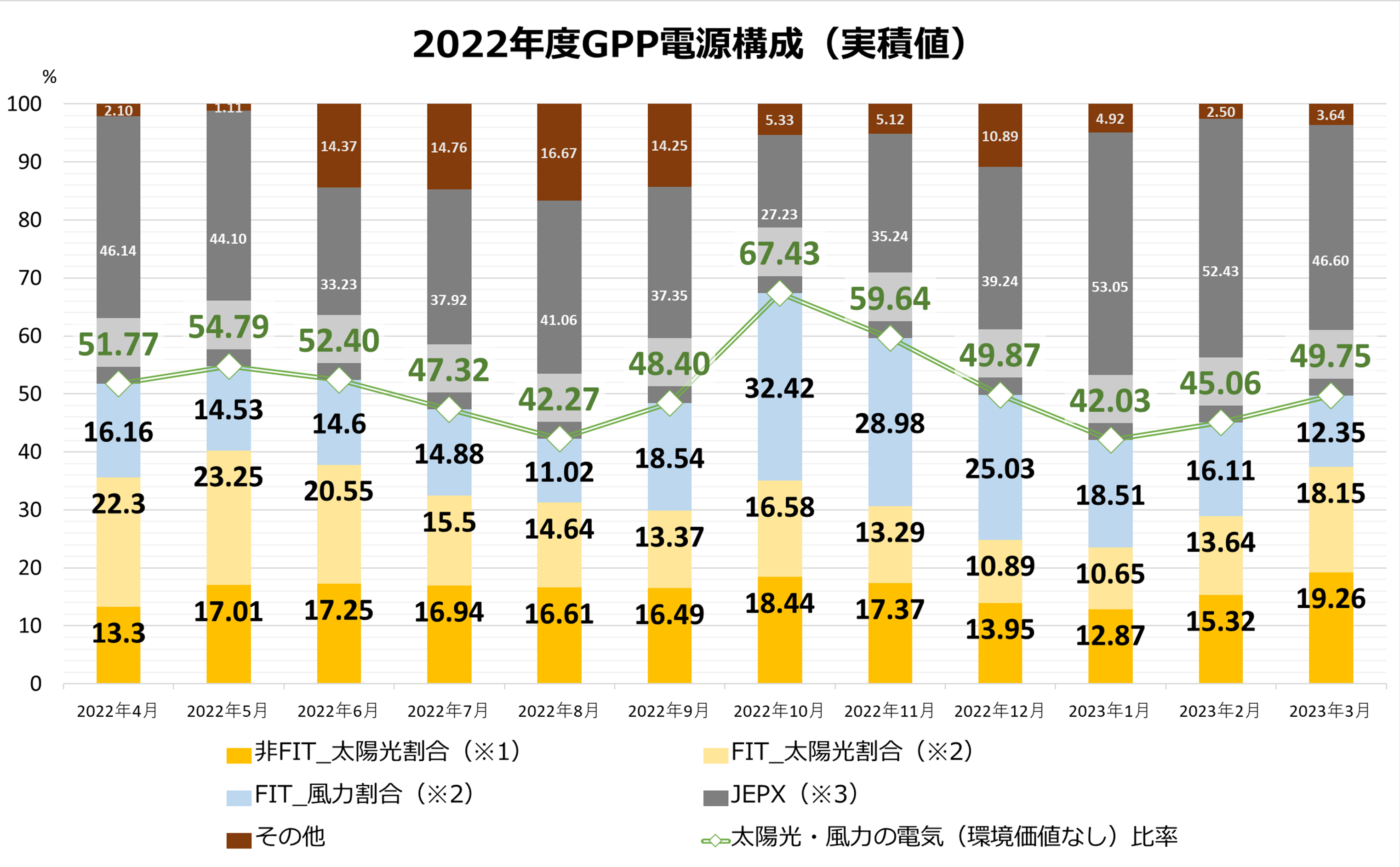 GPP電気はFIT太陽光とFIT風力、非FIT太陽光の電気を皆様に供給してまいりました。しかし非化石証書をつけなければ「再エネ」との表記は認められないこととなりました。そこで2023年度以前の電気は「再エネ」の表記を削除し、「太陽光と風力の電気」(環境価値なし)」という表記とさせていただきます。これら電力による各年のCO2排出量も明記します。