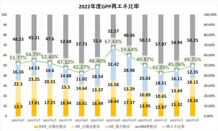 GPP電気はFIT太陽光とFIT風力、非FIT太陽光の電気を皆様に供給してまいりました。しかし非化石証書をつけなければ「再エネ」との表記は認められないこととなりました。そこで2023年度以前の電気は「再エネ」の表記を削除し、「太陽光と風力の電気」(環境価値なし)」という表記とさせていただきます。これら電力による各年のCO2排出量も明記します。