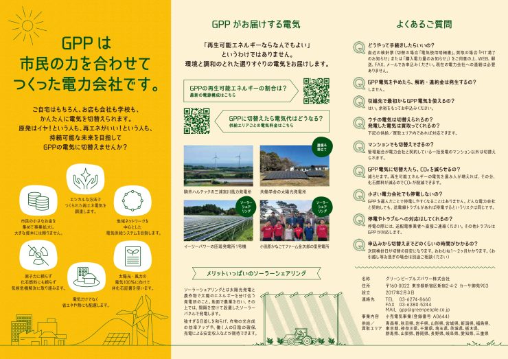 5つあった理念に「電気だけでなく 省エネや熱にも配慮します。」を追加し、非化石証書の文言箇所を「太陽光・風力の電気100%に向けて非化石証書を使います。」に変更しました。合計6つの理念の下、環境と調和のとれた選りすぐりの電気をお届けします。そんなGPP電気をご友人やお知合いへご紹介いただけると嬉しいです!
