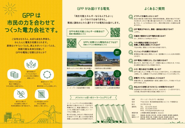 5つあった理念に「電気だけでなく 省エネや熱にも配慮します。」を追加し、非化石証書の文言箇所を「太陽光・風力の電気100%に向けて非化石証書を使います。」に変更しました。合計6つの理念の下、環境と調和のとれた選りすぐりの電気をお届けします。そんなGPP電気をご友人やお知合いへご紹介いただけると嬉しいです!