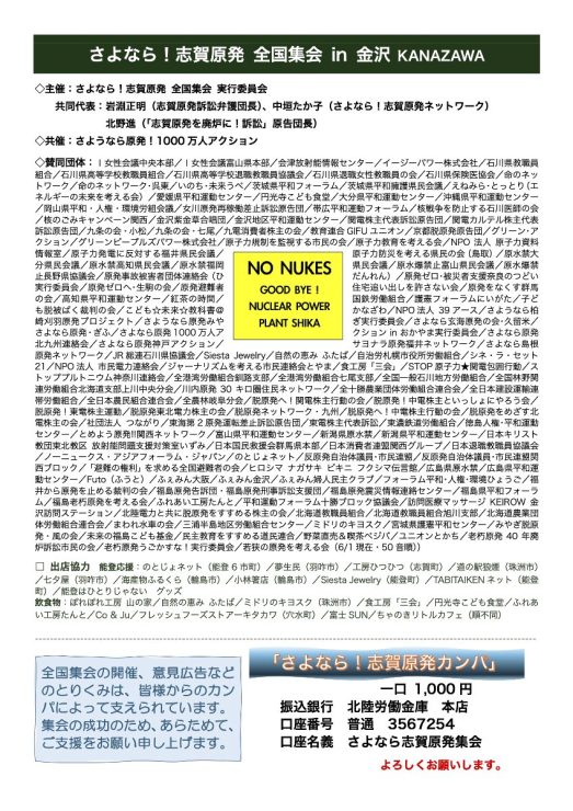 - 主催 さよなら!志賀原発 全国集会実行委員会〔志賀原発を廃炉に!訴訟原告団/さよなら!志賀原発ネットワーク/石川県平和運動センター/原水禁石川県民会議/社会民主党石川県連合/石川県勤労者協議会連合会〕