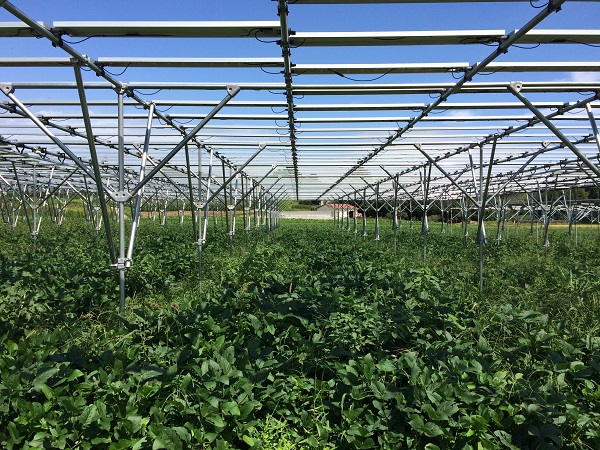 畑の上に間隔を空けて、細い太陽光発電パネルを設置し、農業と発電事業を両立させていることが特徴です。ほどよい日影ができることで、収量が上がるケースも報告されています。