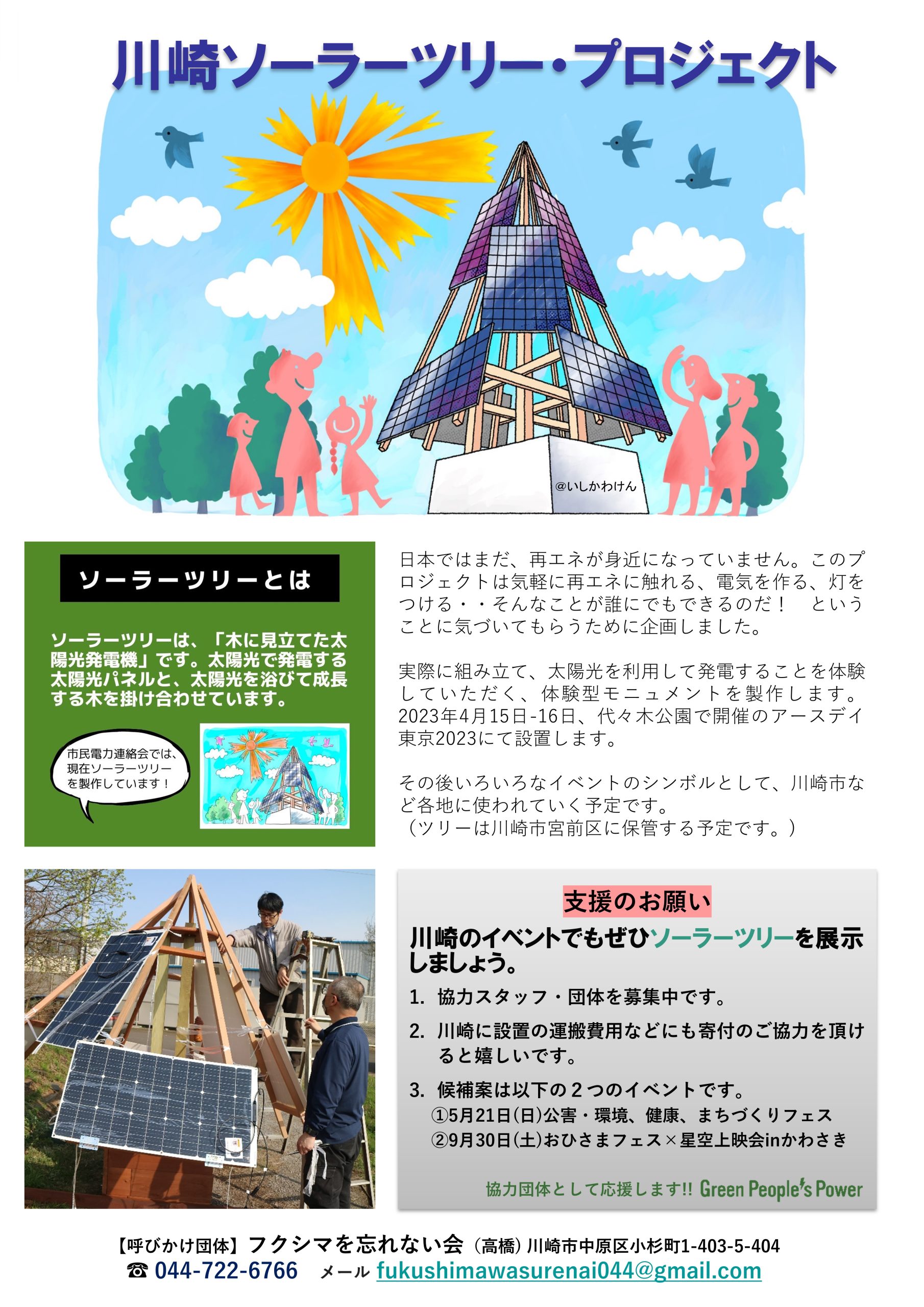 GPP代表の竹村英明が『太陽光発電パネルの木=ソーラーツリー』展示の応援に入ります。
