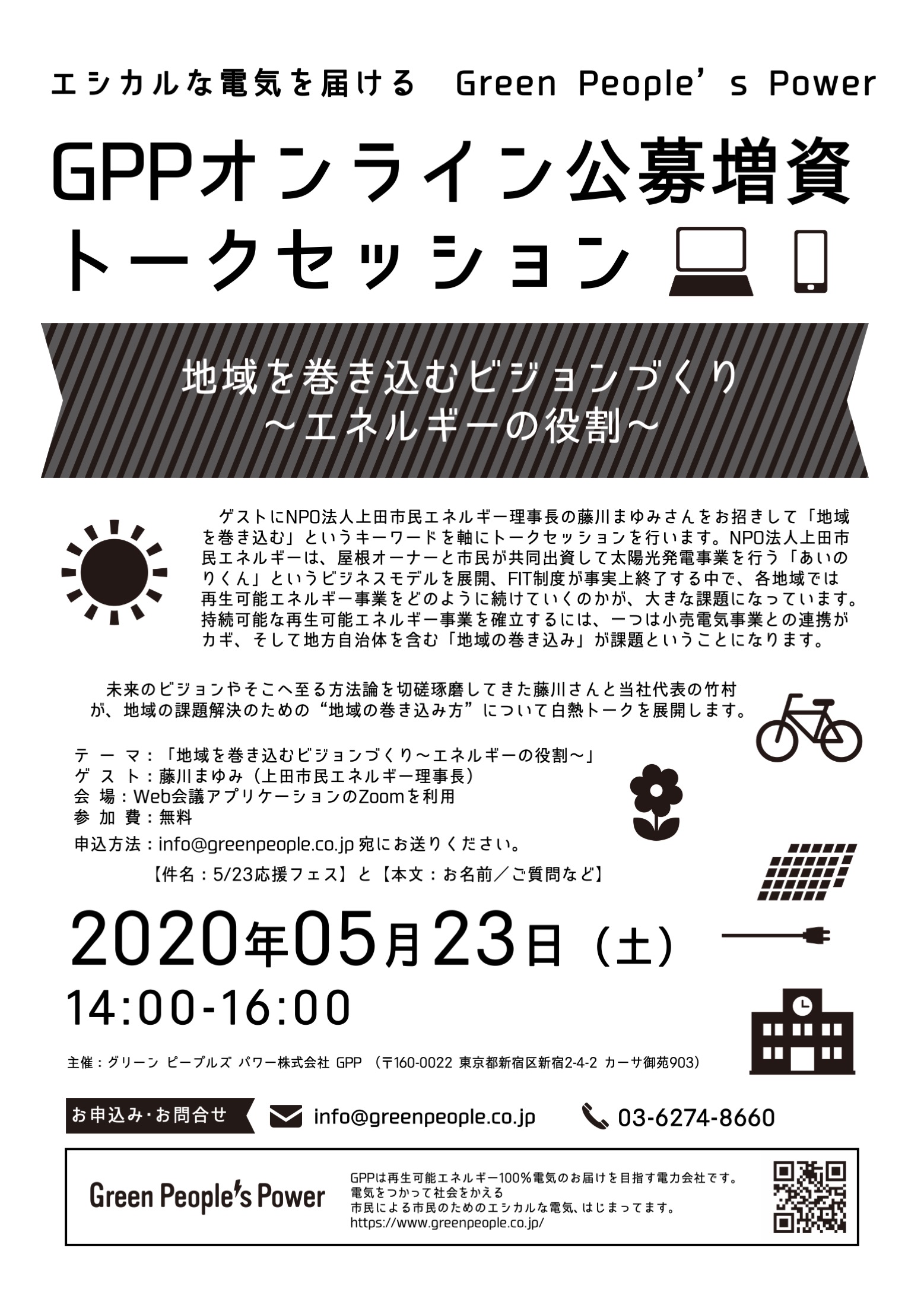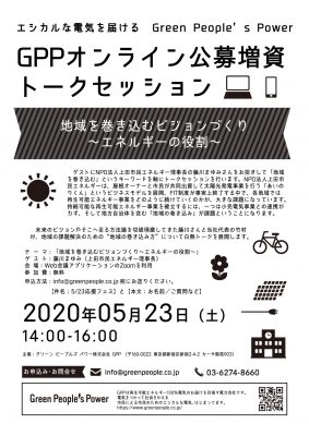 200523-flyer_r3 電気のお申込みはこちらから お申込み トップ 添付ファイル GPPオンライン公募増資トークセッション「地域を巻き込むビジョンづくり~エネルギーの役割~」編 200523-flyer_r3