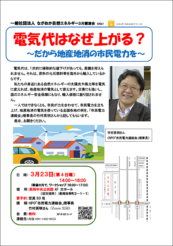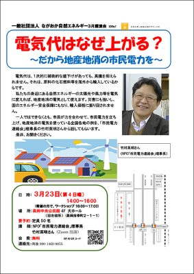 20250323flyer 電気のお申込みはこちらから お申込み トップ 添付ファイル 【宣伝協力☆竹村Zoom登壇】電気代はなぜ上がる?~だから地産地消の市民電力を~@新潟県長岡市 20250323flyer