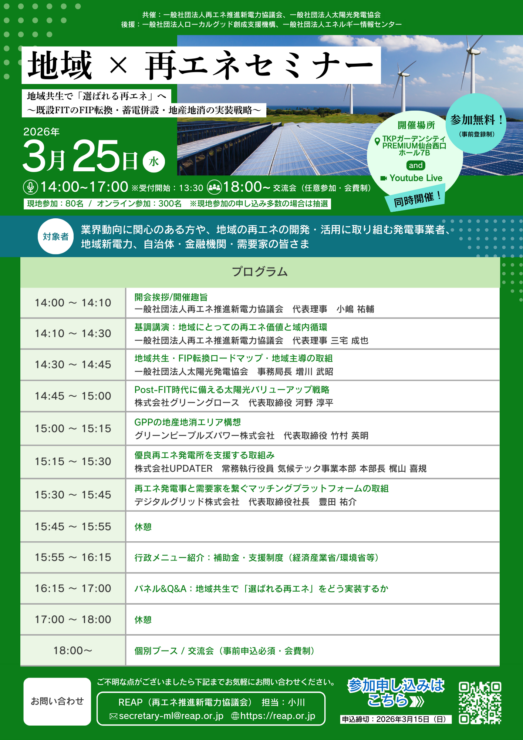竹村登壇☆REAP主催「地域×再エネセミナー」(仙台会場+YouTube Live/参加無料)