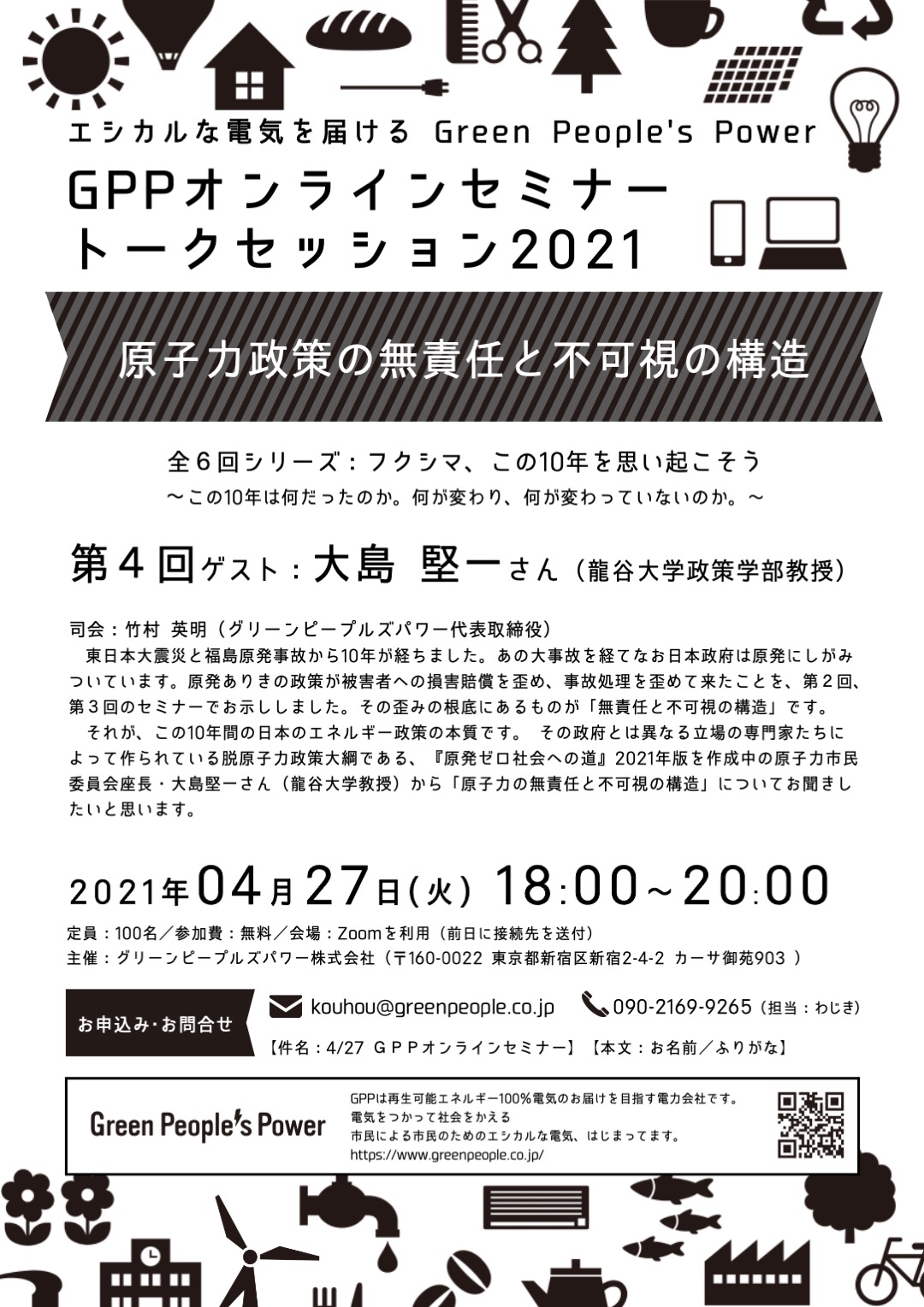 それが、この10年間の日本のエネルギー政策の本質です。 その政府とは異なる立場の専門家たちによって作られている脱原子力政策大綱である、『原発ゼロ社会への道』2021年版を作成中の原子力市民委員会座長・大島堅一さん(龍谷大学教授)から「原子力の無責任と不可視の構造」についてお聞きしたいと思います。