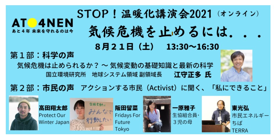 20210821stoptikyuuonndannka 電気のお申込みはこちらから お申込み トップ 添付ファイル 協賛『STOP!温暖化講演会 2021 気候危機を止めるには... 「科学の声」と「市民の声」』 20210821stoptikyuuonndannka