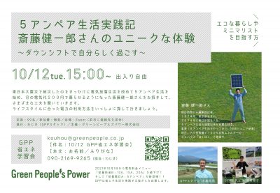 20211012 GPP_Energy-saving 電気のお申込みはこちらから お申込み トップ 添付ファイル GPP省エネ学習会「5アンペア生活実践記」斎藤健一郎さんのユニークな体験~ダウンシフトで自分らしく過ごす~ 20211012 GPP_Energy-saving