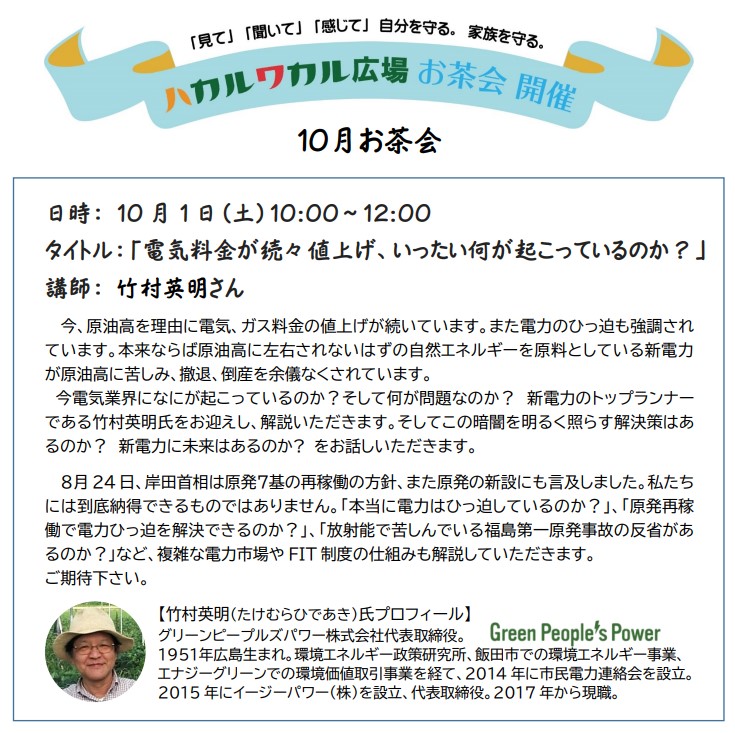 八王子にある「市民放射能測定室ハカルワカル広場」さん主催のお茶会で、竹村が話します。