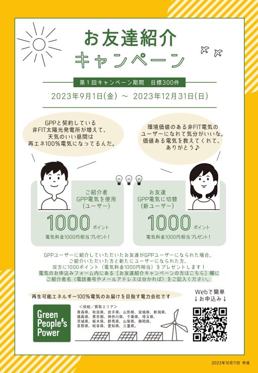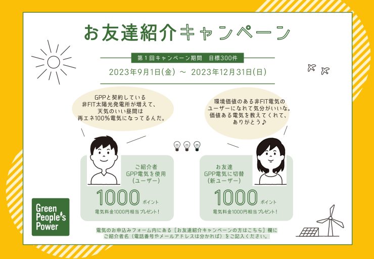 お友達紹介キャンペーン 電気料金1000円相当プレゼント!! 2024/9/30マデ延長 | Green People's Power