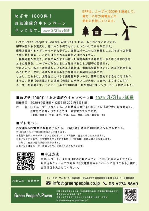 2021年 めざせ1000件!お友達紹介キャンペーン | Green People's Power