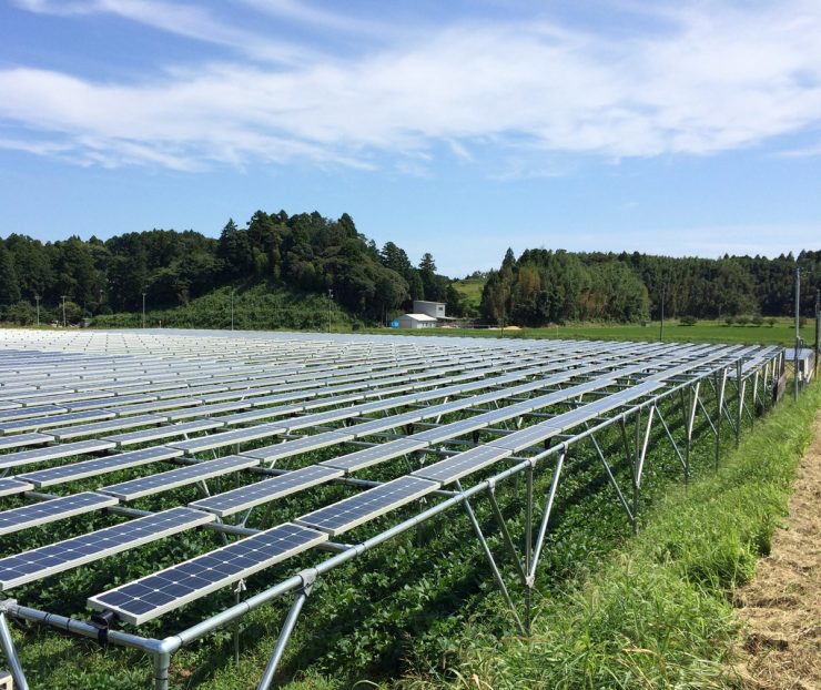 畑の上に間隔を空けて、細い太陽光発電パネルを設置し、農業と発電事業を両立させていることが特徴です。ほどよい日影ができることで、収量が上がるケースも報告されています。